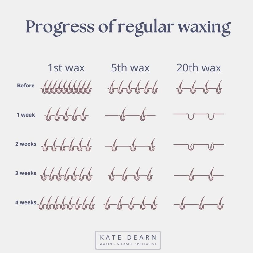 If you’ve been shaving, it may take a few waxes to get the ‘silky smooth’ results you’ve been promised on the telly adverts. Due to the hair growth cycles, you could still have dormant previously shaved hairs waiting to grow months after your first wax. So when these shaved hairs do finally decide to grow through they will feel like stubble. On average it takes about 3 waxes 4-6 weeks apart to start catching the majority of these cycles. But bare in mind, every time you shave between waxes, you’re going to get stubble for probably another 2 or 3 waxes after, til it’s fully grown out.