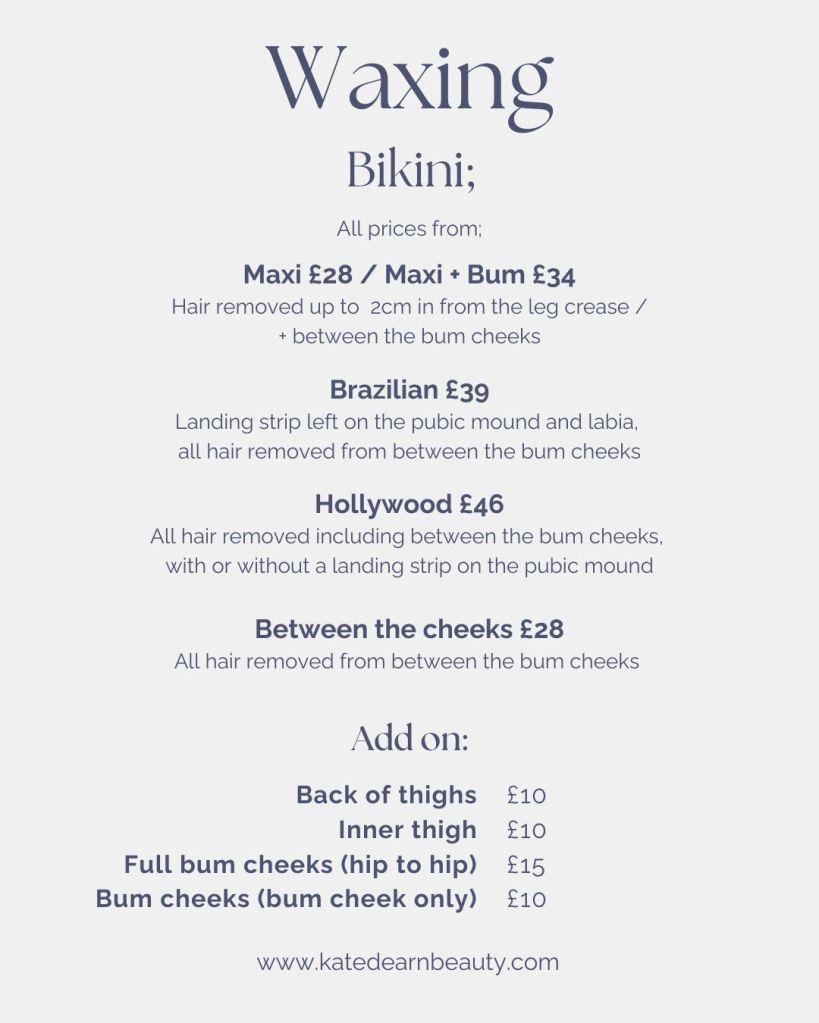 I have been performing intimate waxing for over 20 years and I perform hundreds of bikini waxes each year. In 2021 I was selected to be part of HABIAS Expert Working Group tasked with the update of the National Occupational Standards, this is the government framework in which all therapists and training courses should meet. So you’re in safe hands!